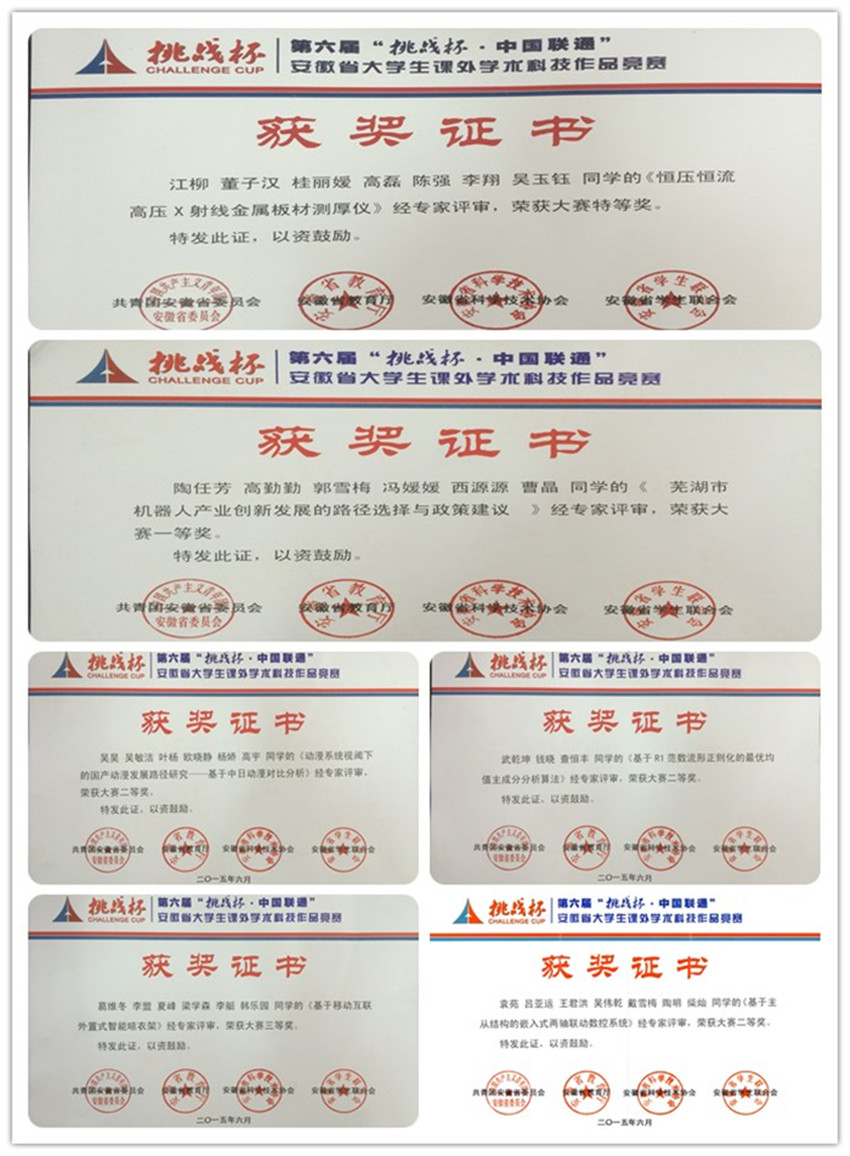 经过书面评审、作品展示、PPT汇报和秘密答辩等环节,我校推报的作品《恒压恒流高压X射线金属板材测厚仪》(作品来源:电气工程学院,指导教师:王冠凌和代广珍,团队负责同学:江柳)因科学性、创新性、现实意义突出,受到专家一致好评,荣获大赛特等奖;《芜湖市机器人产业创新发展的路径选择与政策建议》(作品来源:管理工程学院,指导教师:何朝林,团队负责同学:陶任芳)荣获一等奖;《基于R1范数的流形正则化的最优均值主成分分析算法》(作品来源:计算机与信息学院,指导教师:卢桂馥和唐肝翌,团队负责同学:武乾坤)、《动漫系统视阈下国产动漫路径研究—基于中日动漫对比分析》(作品来源:思政部,指导教师:方前移,团队负责同学:吴昊)、《基于主从结构的嵌入式两轴联动数控系统》(作品来源:电气工程学院,指导教师:陈孟元,团队负责同学:袁苑)荣获二等奖、《基于移动互联外置式智能晾衣架》(作品来源:机械与汽车工程学院,指导教师:阚宏林,团队负责同学:葛维冬)荣获三等奖。我校因竞赛总成绩突出,组织工作优秀,荣获大赛“优胜杯”。