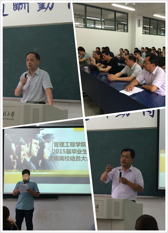 又是一年毕业季,为保证毕业生安全、有序、文明、满意离校,切实抓好本院毕业生文明离校教育管理和服务工作,6月9日下午,管理工程学院2015届毕业生文明离校动员大会在6教102教室顺利召开。2011级全体学生党员、学生干部参加大会,院党委书记汪张林,副书记、副院长何朝林,毕业班全体辅导员参加了会议。会议由院团委指导老师何惠妍主持。