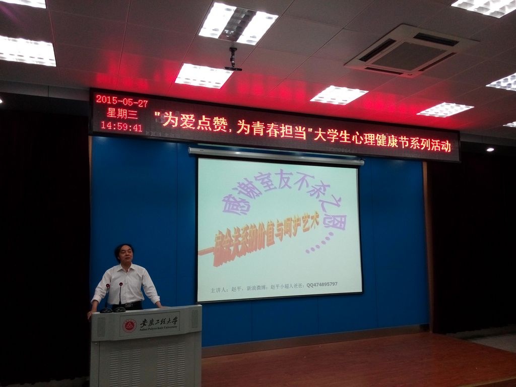 5月27日,来自安徽师范大学的赵平教授给同学带来了题为“宿舍情谊的价值与培养”的心理健康讲座,来自生化学院和人文学院的同学聆听了讲座。讲座从“宿舍人际关系的心理意义与人才意义”、“宿舍关系的现状”及“宿舍问题的消解”三个方面展开。他将历史典故、流行歌词或成语俗语巧妙地融入其中,形象生动地分析了造成室友情谊冲突的原因,提倡人际交往中应遵循“尊重、真诚、宽容、互助合作”的原则。赵平说:“和谐的寝室环境是我们共同的诉求。在与室友发生矛盾时,我们需要改变自己的心态,退一步海阔天空。我们要学会与室友沟通,说出心底最真实的感受。”现场的同学表示受益匪浅,意识到了应当珍惜室友间的情谊,构建和谐寝室。