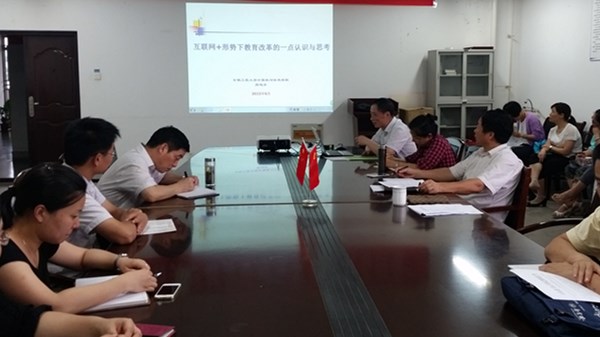 6月17日下午,校党委副书记、校长刘宁参加了计算机与信息学院教师周三业务学习会。会上,计算机与信息学院院长周鸣争围绕“深化综合改革,建设高水平大学”教育思想观念大讨论主题,结合学院教育教学实践,作了题为《“互联网+”形势下教育改革的一点认识与思考》的主题报告。他介绍了“互联网+”的内涵、特征、主要支撑技术以及现实中的应用案例,重点阐述了“互联网+”形势下计算机与信息学院在人才培养模式、专业建设、课程建设、实践环节、教学团队、学科建设等方面教育教学改革实践和思考。