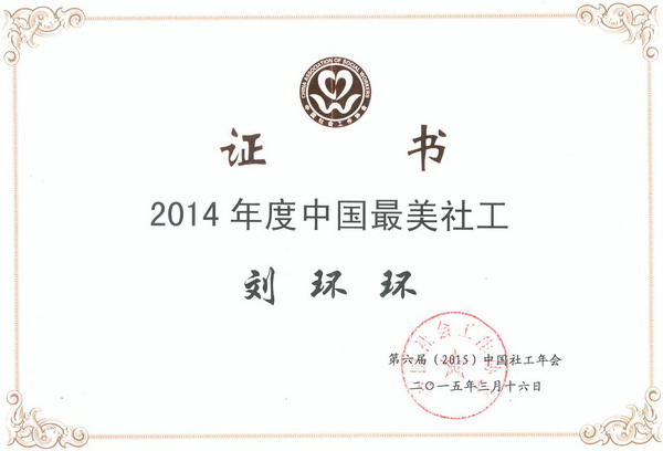 近日,从在北京举办的第六届(2015)中国社工年会上传来喜讯,我校人文学院2010届社会工作专业毕业生、合肥市蜀山区民生社会工作服务社副总干事刘环环,作为安徽省仅有的两名受表彰者,荣获了由中国社会工作协会评选并颁发的2014年度“中国最美社工”称号。