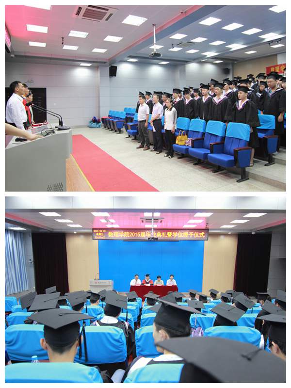 毕业典礼在庄严的国歌声中拉开了序幕。水心宝宣读学校授予2015届毕业生学士学位和关于表彰2015届优秀毕业生和2014-2015学年度毕业生先进个人的决定。随后,每一位毕业生身着学士服,踏上红地毯,接受数理学院学位委员会主任委员费为银教授扶正流苏。