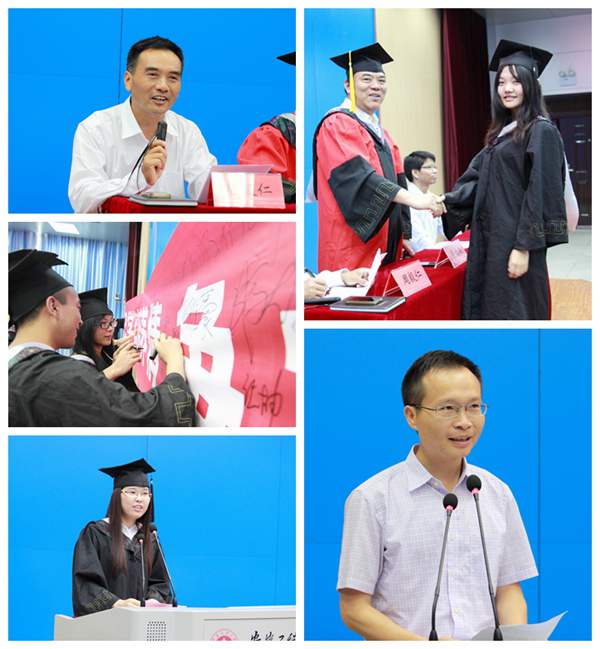 教师代表邓寿年在发言中饱含深情的说,如果今天的发言也算做讲课的话,它将是同学们在大学中的最后一课,唯一的区别是,这堂课的考试并不在课堂上进行,而是需要同学们在社会上,用几年、几十年的时间,去慢慢完成答卷,让社会对同学们进行评判。希望同学们坚定自己的梦想,继续学习,在平淡中创造出精彩。