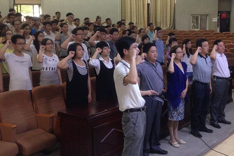 苏国红指出,入党宣誓是对建党94周年的隆重纪念,也是对全体党员的一次深刻教育。近年来,学校在人才培养、科学研究、社会服务、文化传承创新等方面均取得了显著的成绩,在国内、省内的影响力逐步提升。成绩的取得得益于校党委的坚强领导,是全体师生员工特别是全校各级党组织、全体共产党员共同努力的结果。她希望全体党员,一是要牢记入党誓词,努力去践行自己对党表达的决心。二是要坚定理想信念,树立远大的共产主义理想和坚定的信念,不为眼前的各种复杂现象所困惑。三是要珍惜荣誉、担起责任,按照“五带头”的要求,“诚实做人、踏实做事、扎实做学问”,真正做到“干在实处、走在前列”,成为身边同学学习的标杆和榜样,用实实在在的行动和成绩帮助同学、信服同学、带动同学。她强调,一个党员就是一面旗帜,全体党员都要牢记责任和承诺,紧紧围绕学校发展目标任务,确立成长成才目标,共同为实现“中国梦”、“强校梦”、“成才梦”而不懈奋斗。