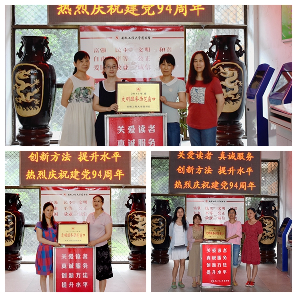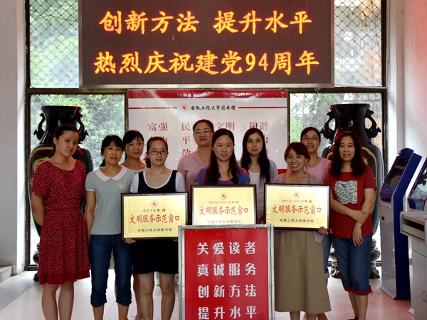 在建党94周年来临之际,为在全馆员工中树立学习的榜样和目标,营造“比先进、学先进、赶先进、超先进”的良好氛围,强化“读者第一,服务至上”的工作理念,图书馆开展了“文明服务示范窗口”的评选活动。经全馆职工民主推荐、读委会成员和读者评选,并经馆内公示,最终借还书处、参考咨询台和社会科学图书借阅区(1)三个窗口从十五个候选一线服务窗口中脱颖而出,荣获图书馆2015年度“文明服务示范窗口”的光荣称号。
