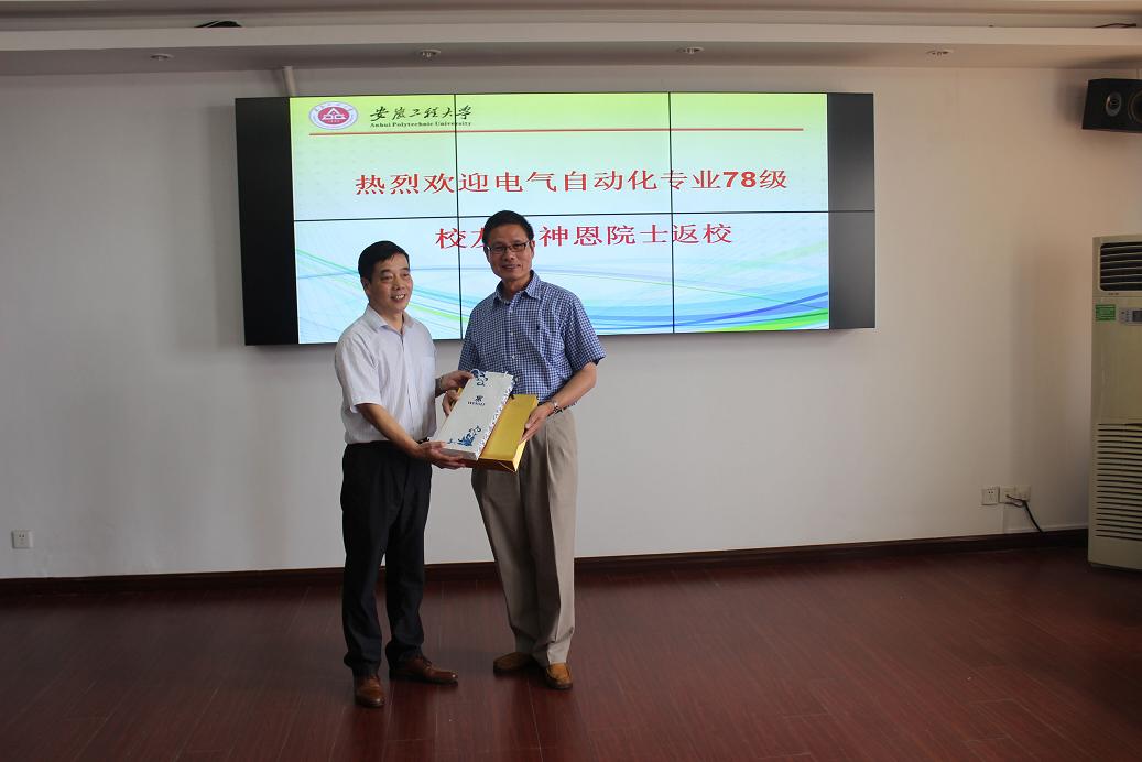 刘宁致欢迎词。他首先代表全校师生对钱神恩院士和各位电气自动化专业的78级校友返校表示热烈欢迎,并简要介绍了学校的建设发展,以及80周年校庆活动的筹备与开展情况。他说,钱神恩院士作为国际一流的科学家,在卫星对地观测载荷等领域具有深厚造诣和丰硕成就,为学弟学妹树立了榜样,也为母校赢得赞誉。学校当前正处于内涵发展、特色发展的关键时期,积极实施“走出去”战略,与芜湖市政府、省内外有关知名企业建立了全面的战略合作关系,与国(境)外知名高校积极开展交流合作,在人才培养、科学研究、社会服务、文化传承与创新上均取得了一系列的新成就;衷心感谢校友们对母校发展的关心与支持,欢迎钱神恩院士和广大校友常回家看看。