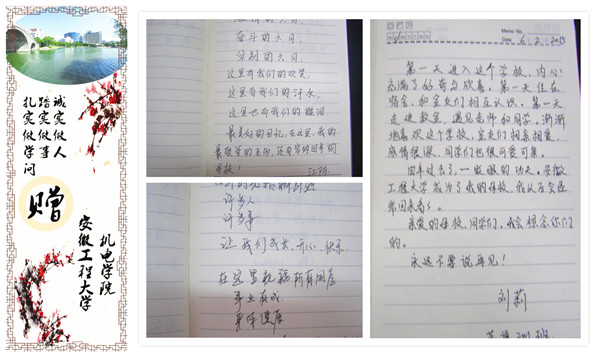 通过这些主题活动的开展,毕业生将满满的正能量内化于心、外化于行。自图书馆今年开展图书捐赠活动以来,共收到2015届毕业生捐赠的非教材类图书共600余册;学生处在毕业生中组织了“暖瓶暖心”活动,学弟学妹领到暖水瓶时,露出了温暖的笑意;纺服学院举办“众创空间”服装毕业汇报演出,对遴选出来的46个系列、165套创意作品进行展示;机电学院毕业生亲手制作精美的书签和留言册,把浓浓的不舍与感恩化为行行美丽的字符;建工学院毕业生将自己画图的大画板满满地摆成一排,等着低年级的同学来领,有的还写上一行“赠语”,并且留下姓名,他们说:“这些画板要一代一代的传下去,每传一个人都要签上名字。”