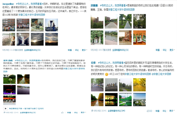 学生处举办“毕业季,最美的你”毕业生主题照片征集比赛,设置最美、最佳创意、最具感染力毕业照奖等奖项,并将获奖作品在校园网上展示。当同学们得知此活动后,踊跃参与,他们高兴地说:“这下太好了,可以‘上头条’啦!”同时,各学院还在团属微博、微信中开展毕业季随手拍活动,如外国语学院开展的“母校这么大,我想再看看”微博随手拍活动,透过照片和文字来记录这个季节,定格美好。