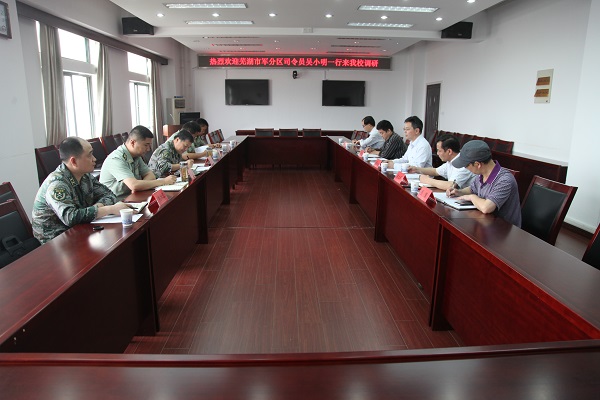 7月9日上午,芜湖市军分区司令员吴小明一行6人来校调研。校党委书记陈其工会见了调研组,对吴小明一行来我校调研表示感谢和欢迎,并请调研组对我校大学生征兵工作进行指导。副校长郭兴众主持座谈会,双方围绕大学生征兵工作中存在的难点、大学生退役优抚待遇等方面的问题进行了座谈,校武装部部长陈其峰、学生处处长张开炳、校办公室副主任程繁等参加座谈会。