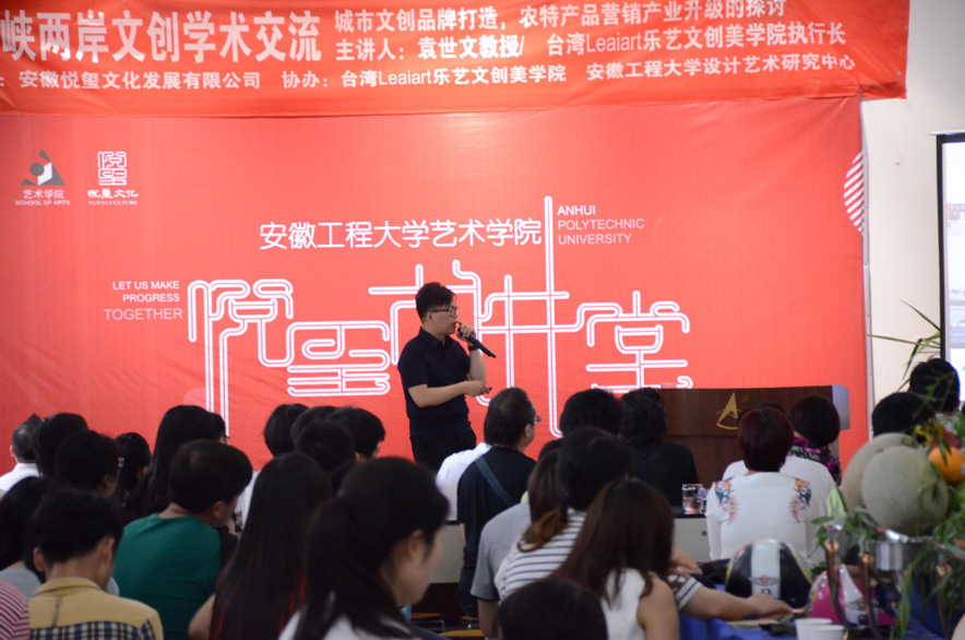 2015年7月17日下午,我校省级人文社科重点研究基地设计艺术研究中心与安徽悦玺文化发展有限公司,在艺术学院一楼展厅举办“2015年海内外设计专家系列论坛”第二场活动,即海峡两岸文化创意主题雷竞技rebent 。设计艺术研究中心主任、艺术学院院长黄凯,艺术学院部分专业教师、研究生、本科生,芜湖市文产办、市工商局、市农委、旅游产业等相关负责人,参与了此次学术交流活动。