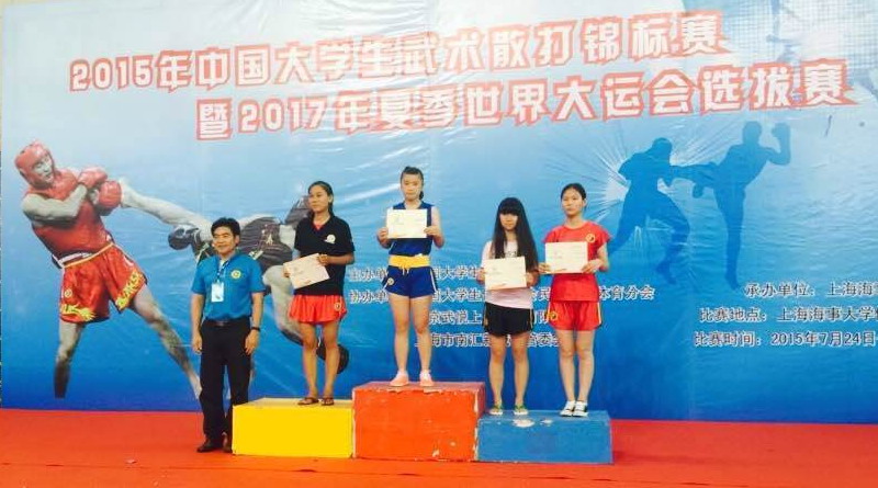 7月26日-28日,2015年中国大学生武术散打锦标赛暨2017年夏季世界大运会选拔赛在上海海事大学体育馆隆重举行。我校4名运动员在胡昌领老师指导下,顽强拼搏,获得1金和2个第五的好成绩,其中孙梦捷获得女子56KG级冠军(人文学院 法学131)、廖天奇获得男子80KG级第五名(人文学院 法学141)、杨俊杰获得男子60KG级第五名(人文学院法学141),充分展现了我校运动健儿的风采,为学校争得荣誉。本次赛事由中国大学生体育协会主办,中国大学生体协民族传统体育分会、北京武悦上品商贸有限公司、上海市南汇新城镇人民政府协办,上海海事大学承办。共有来自北京体育大学、上海体育学院、集美大学、河南大学等全国32所大学的代表队参加了比赛。中国大学生武术散打锦标赛于今年首次举行,尤其是2017年将列入世界大学生运动会正式比赛项目,这不仅是中国大学生武术散打界的首次聚会,更是一次具有里程碑意义的盛会,必将推动我国学校武术散打运动的普及和发展。