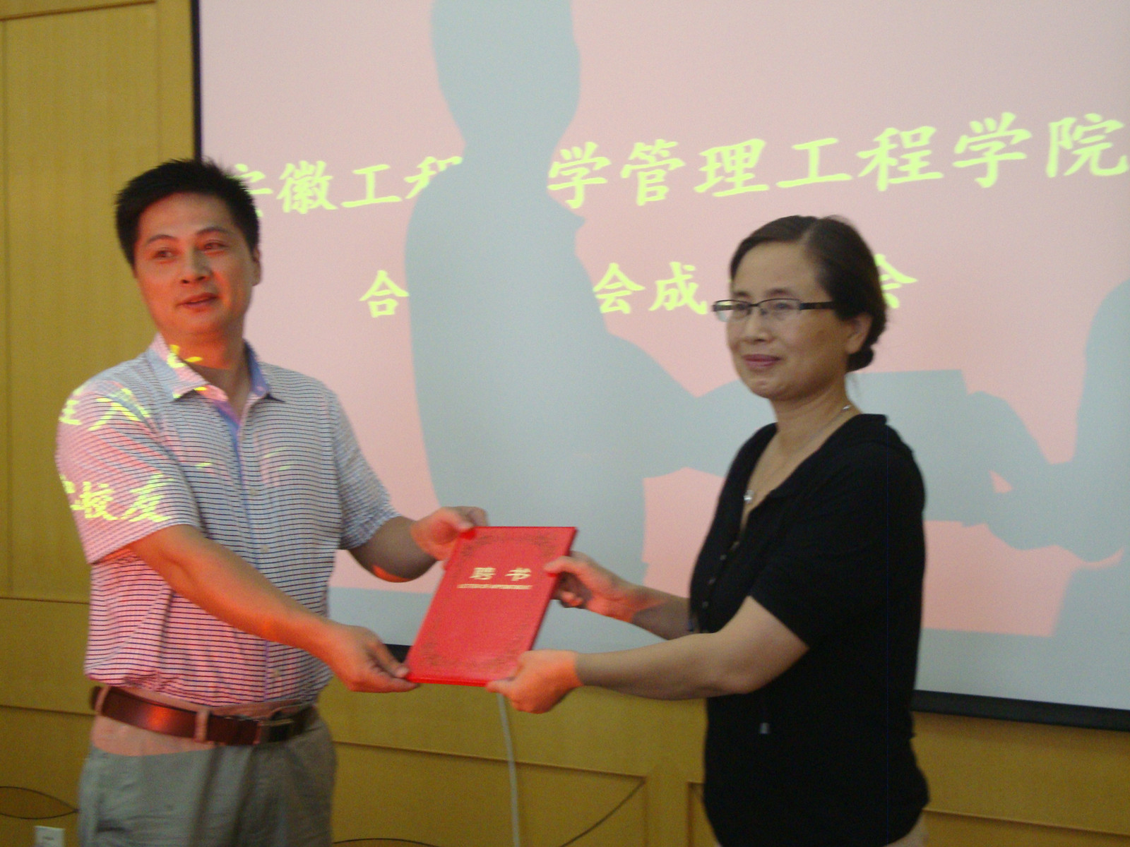 苏国红为管理工程学院合肥校友会会长颁发了聘书;主席台在座领导为副会长、秘书长、副秘书长颁发了聘书。