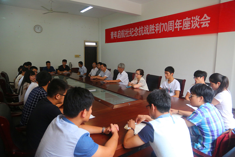 阅兵式后,青年启航社抗战胜利70周年座谈会在团委会议室召开。社团成员结合学校组织观看的影片《百团大战》和阅兵仪式的盛况,表达了铭记历史、缅怀先烈的决心,抒发了对祖国的深切祝愿和美好祝福。2012级化学工程专业于奇奇说,今天最直观的感受就是自豪,为身处伟大的国家而骄傲,作为大学生,我们更应该好好珍惜和平年代的幸福生活,努力学习文化知识,为祖国的建设做出应有的贡献。2012级信息工程专业韩涛表示没有经历过战争90后的我们,更加要坚定地捍卫和认识历史,铭记历史、缅怀先烈,不是要仇视,而是为了更好地前行,使中华民族永远屹立在世界民族之林。2013级电子工程专业许智敏说很多同学的微博、朋友圈和空间等新媒体平台已经被阅兵式刷屏了,大家都在为祖国的强大点赞,我们当代青年有着自己的表达方式,但爱国的热情是一样的。