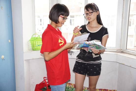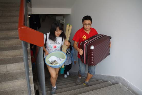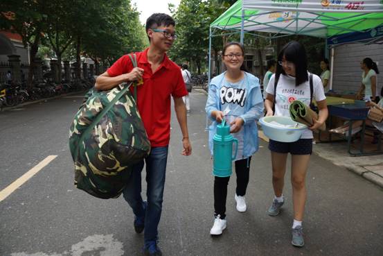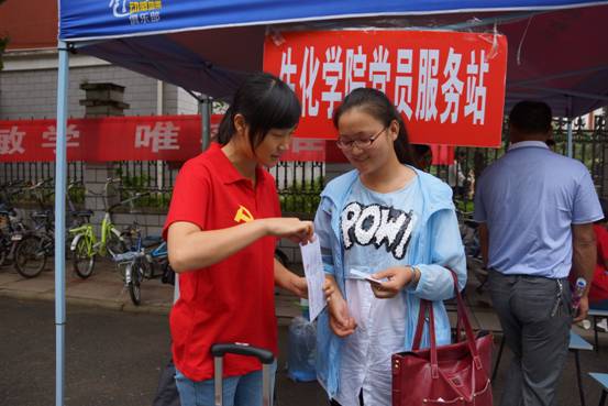 新生和家长一到宿舍区,就能看到生化学院在女生2号楼、男生24号楼前设立的“学生党员服务站”醒目标志。那里,生化学生党员们用微笑迎接每位新生和家长,主动接过他们沉重的行李,引导他们领取生活用品,帮助他们到宿舍入住,让刚踏入陌生环境的新生们感受到了到生化学生党员的热情和温暖。