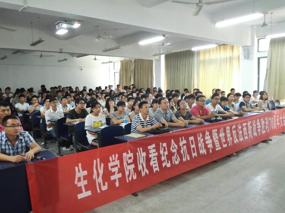 9月3日上午9:00,生化学院组织全体党员在6教112教室观看抗日战争胜利70周年阅兵电视直播,学院党委副书记章兵、各支部书记、辅导员参加了此次活动。