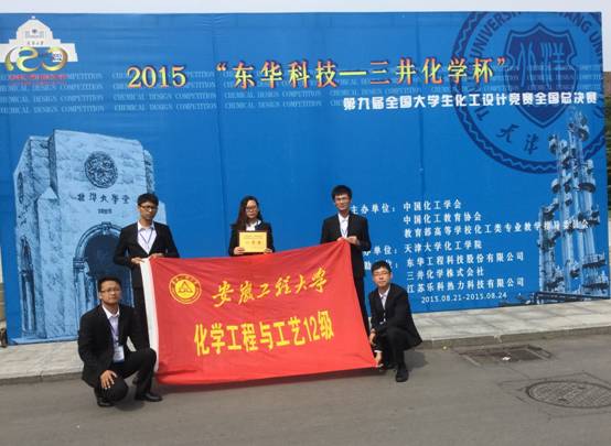 8月21日至24日,2015年“东华科技—三井化学杯”第九届全国大学生化工设计竞赛全国总决赛在天津大学举行。我校“羟羟联合”团队(队员:赵传明、陈丽君、周龙、戎军辉、王贤德)在李芳、唐定兴、方兴龙等老师的指导下,以优秀的设计作品和精彩的现场答辩脱颖而出,荣获全国总决赛一等奖,取得了历史性突破。