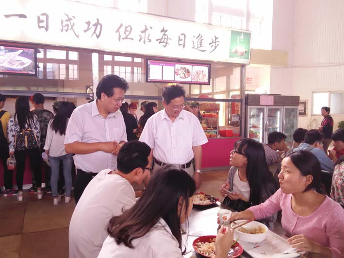 陈鹏一行逐个检查了校园西区所有学生食堂的供餐情况,仔细察看了食堂饭菜花色品种、售卖价格、就餐大厅秩序与卫生保洁情况、风味特色窗口所占比例等,以及食堂天然气安全改造工程与食堂明厨亮灶工程等项目竣工使用情况,并询问就餐学生对饭菜质量与饭菜价格是否满意,同时就我校在学生食堂风味特色窗口“五统一”管理、原材料集中统一采购等方面的制度规定和具体做法进行了深入了解。