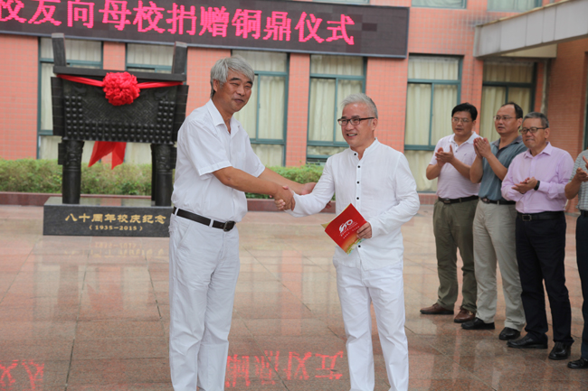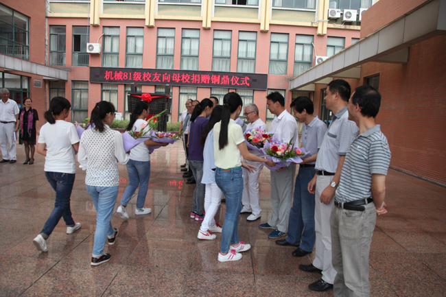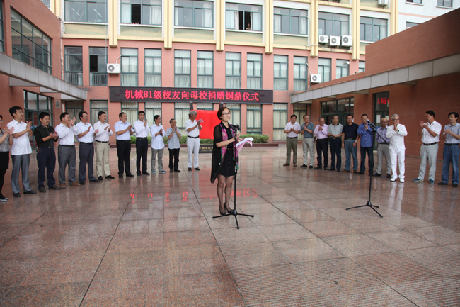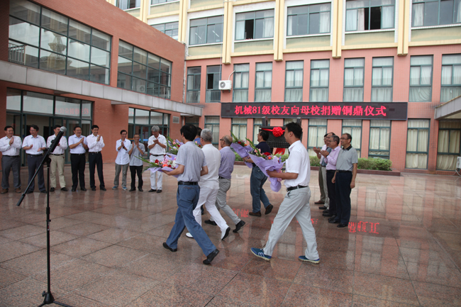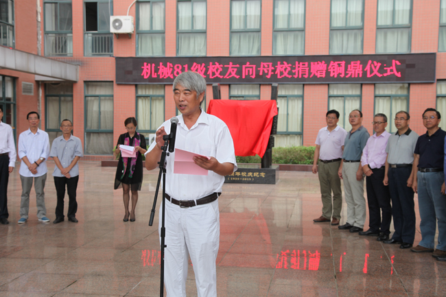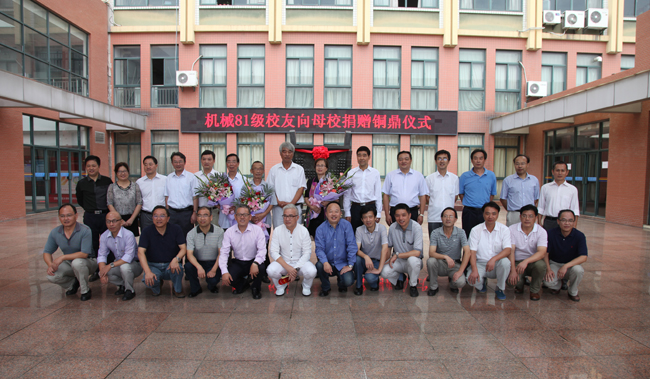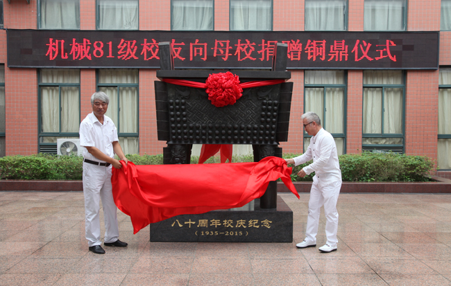 九月金秋,丹桂飘香,机械81级全体校友时值三十周年返校之际,向母校捐赠80周年校庆纪念铜鼎祝贺母校80周年华诞。9月20日上午,捐赠仪式在校行政楼前广场举行。校党委书记陈其工、校党委副书记苏国红、机械81级校友代表、老教师代表、有关职能部门和机械与汽车工程学院负责人以及部分新生代表参加了捐赠仪式。仪式由苏国红主持。