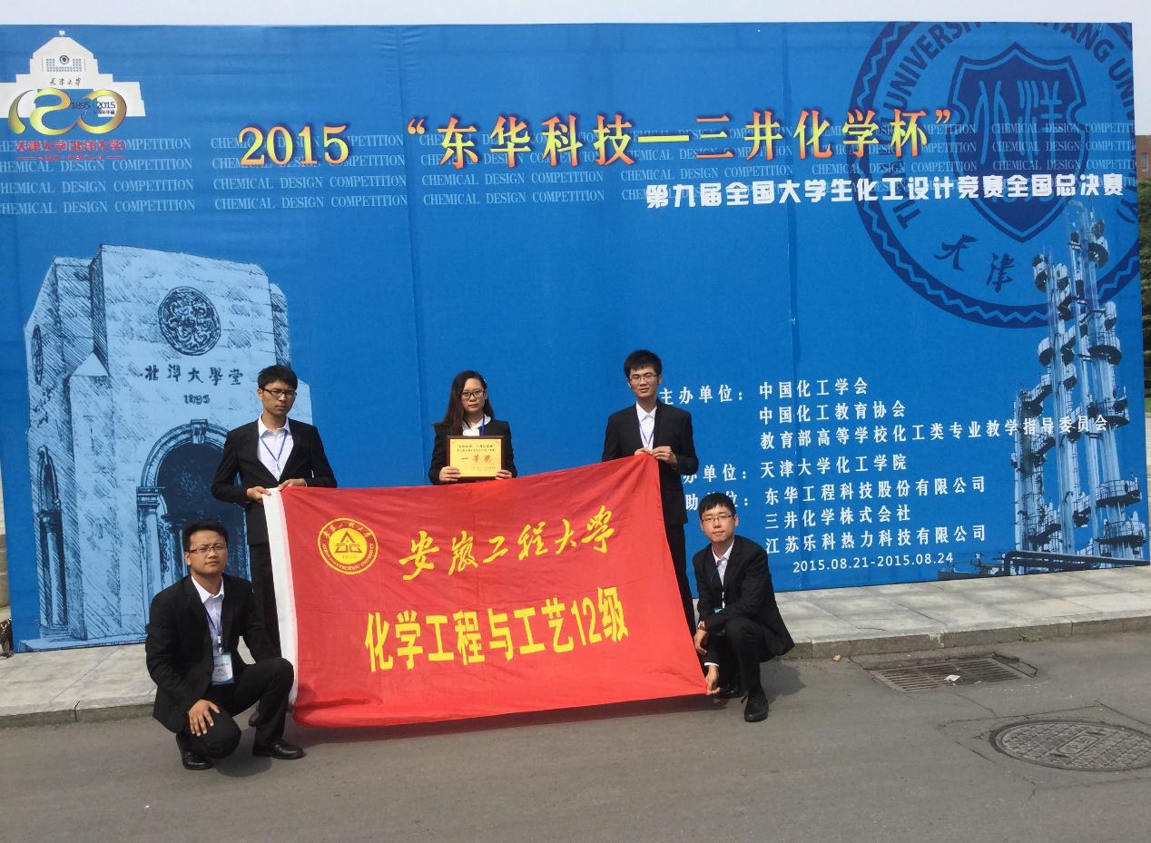 近日,2015年“东华科技-三井化学杯”第九届全国大学生化工设计竞赛全国总决赛在天津大学举行。我校“羟羟联合”团队(队员:赵传明、陈丽君、周龙、戎军辉、王贤德)在李芳、唐定兴、方兴龙等几位教师的指导下,以优秀的设计作品和精彩的现场答辩脱颖而出,荣获全国总决赛一等奖,取得了历史性突破。