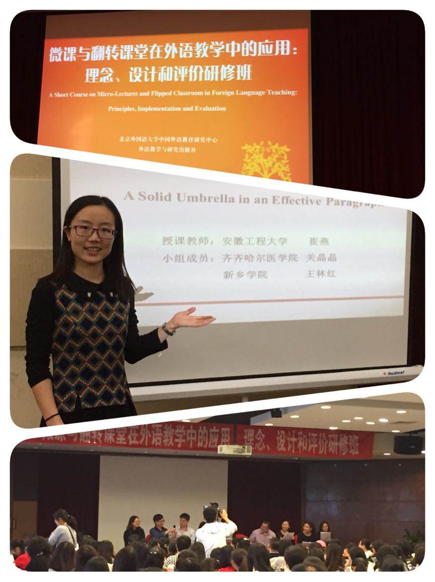 为期两天的系列研修活动紧张而忙碌,却十分充实。研修期间,我校两位教师积极参与大组研修和小组讨论活动,崔燕还代表小组在全体大会上进行了教学展示,并分享了自己对“基于微课的翻转课堂”的理解。微课与翻转课堂是当前热议的教学手段和方法,此次研修为我校正在进行中的大学英语教学改革提供了新视野和新思路。