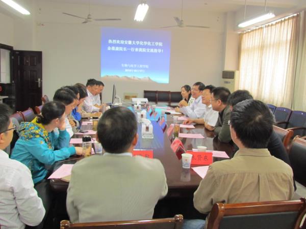 10月17日下午,安徽大学化学化工学院院长金葆康、副院长夏茹、夏林童及部分学科负责人一行6人莅临我院考察交流。交流会在生化学院会议室举行,教务处长陶庭先,科技处副处长吴之传,生化学院副院长陶玉贵、薛正莲以及部分相关人员参加,交流会由薛正莲主持。