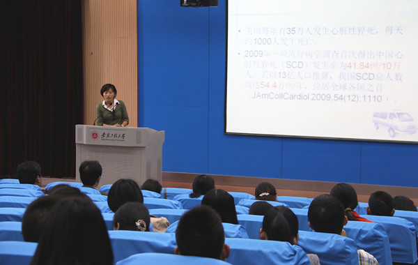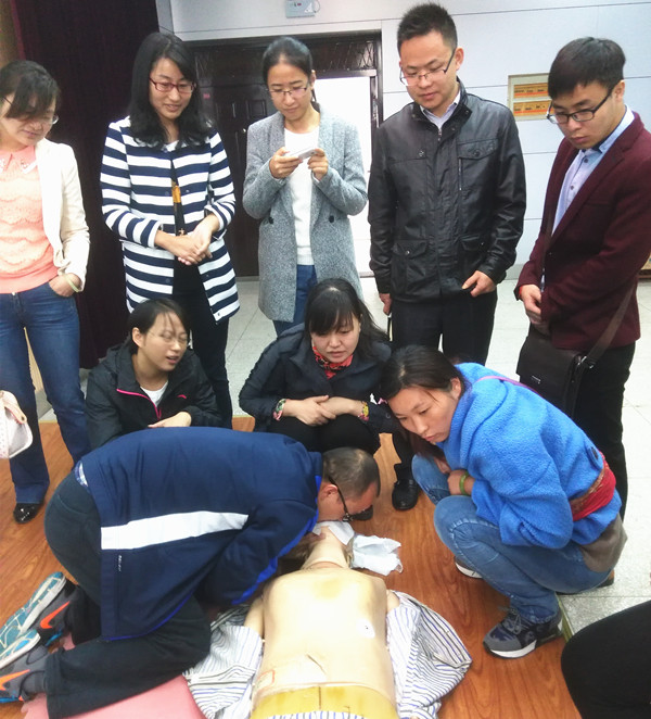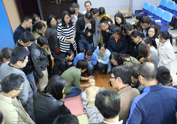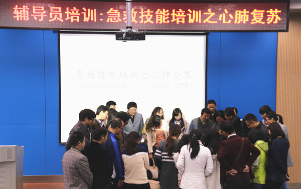 为增加我校辅导员应急救援知识,帮助辅导员掌握基本的现场应急救援技能,进一步提升辅导员应急处置能力,会议邀请了芜湖市第二人民医院心血管内科医师、急救技能培训教练潘桂林来校开展心肺复苏(CPR)急救技能专题培训。针对日常生活和工作中遇到的紧急情况,潘桂林结合典型生动的案例,阐明了“第一目击、有效救援”的重要性。她紧紧围绕心肺复苏主题,从病征评估、呼救求援、体位调整、呼吸判断、胸外按压、开放气道、人工呼吸等救援步骤详细讲解了心肺复苏救援的操作要领,系统普及了“施救者双手永远是第一首选”、“黄金救助4分钟”等急救原则和常识。培训中,潘桂林还利用专业人体模型作了分步演示。培训气氛十分活跃,各辅导员纷纷走到台前,现场进行了操作练习和应用演练。