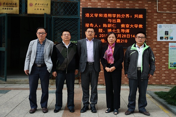 10月28日下午,我校客座教授、南京大学外国语学院博士生导师、中国语用学会会长陈新仁教授应邀在外国语学院会议室作了题为“语义学与语用学的界面:一种新方案”的学术报告。报告会由外国语学院副院长黄焰结主持,我院全体教师和研究生以及安徽师范大学部分教师,共110余人聆听了报告。