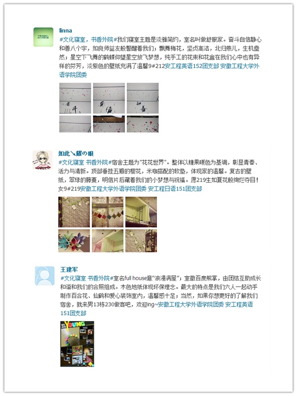 本次比赛增设了以“文化寝室书香外院”为主题的微作品征集,女生9#219和男生13#230等5个寝室获得最佳创意奖。