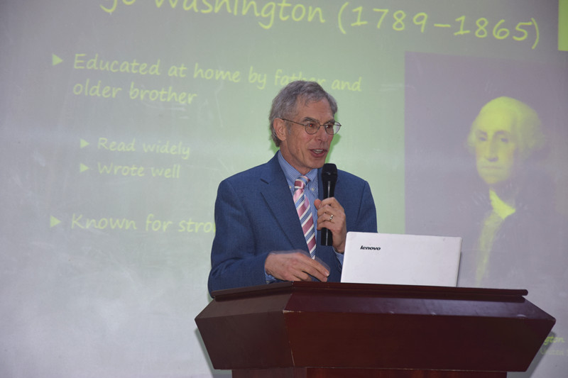 戴德理教授先从《论语》中的“为政以德,譬如北辰,居其所而众星拱之”引入,然后选取华盛顿、麦迪逊、杰斐逊、林肯、里根等11位美国历史上的名人,详细分析他们的品德、性格、家庭等因素为他们赢得了美誉,进而促成他们的成功,这11位人物涵盖从独立战争到冷战后的历史,展示出美国社会的变迁。戴德理教授最后总结指出,领袖人物的道德品行有时超乎其个人能力,他们的成功源自正直、勤奋、守纪、自控力等优良品质以及健康的体魄与良好的人际关系。在接下来的问答会上,在座的师生用流利的英文踊跃提问,戴德理教授对我校学生英文的熟练程度以及问题的深度表示惊叹。
