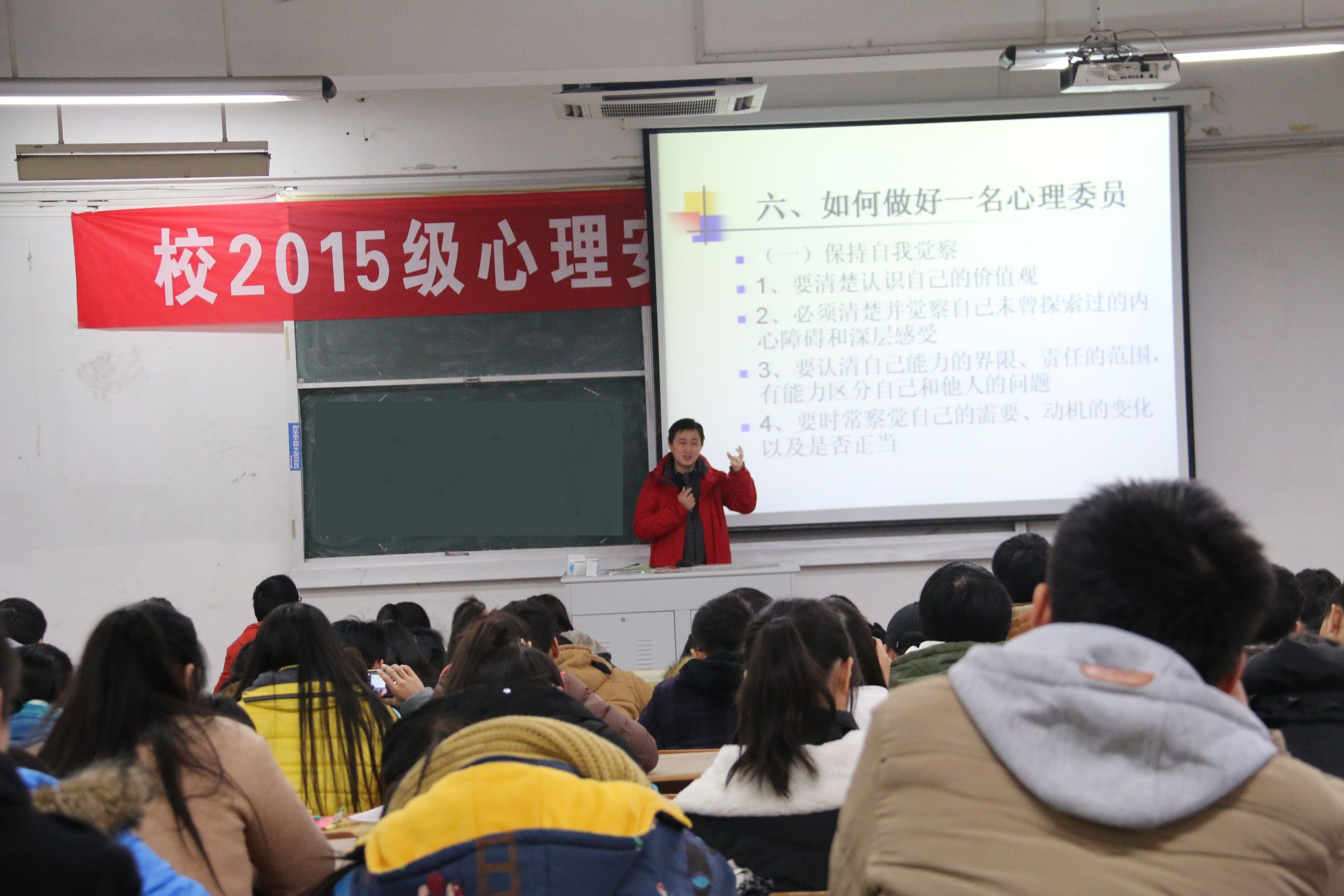 为促进我校心理健康教育和安全教育工作的开展,充分发挥朋辈心理辅导的作用,提升班级心理安全委员工作能力,进一步完善我校心理健康教育和安全教育三级网络机制,11月25日,2015级班级心理安全委员培训班在2教306教室正式开班,本次培训班利用每周三下午开展,分为8个主题,共计四周完成,全体15级心理安全委员参加培训。