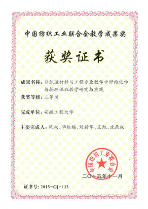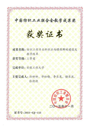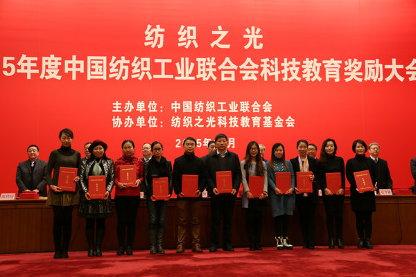 “纺织之光”2015年度中国纺织工业联合会科技教育成果奖励大会由中国纺织工业联合会主办、纺织之光科技教育基金会协办。会议对2015年度中国纺织工业科学技术、教育、技能人才等方面做出创新工作的单位和个人进行表彰。经过评选,由我校凤权老师主持的《非织造材料与工程专业教学中纤维化学与物理课程教学研究与实践》、孙妍妍老师主持的《纺织工程专业针织方向课程群的建设及教学改革》项目分别获得中国纺织工业联合会教学成果三等奖。