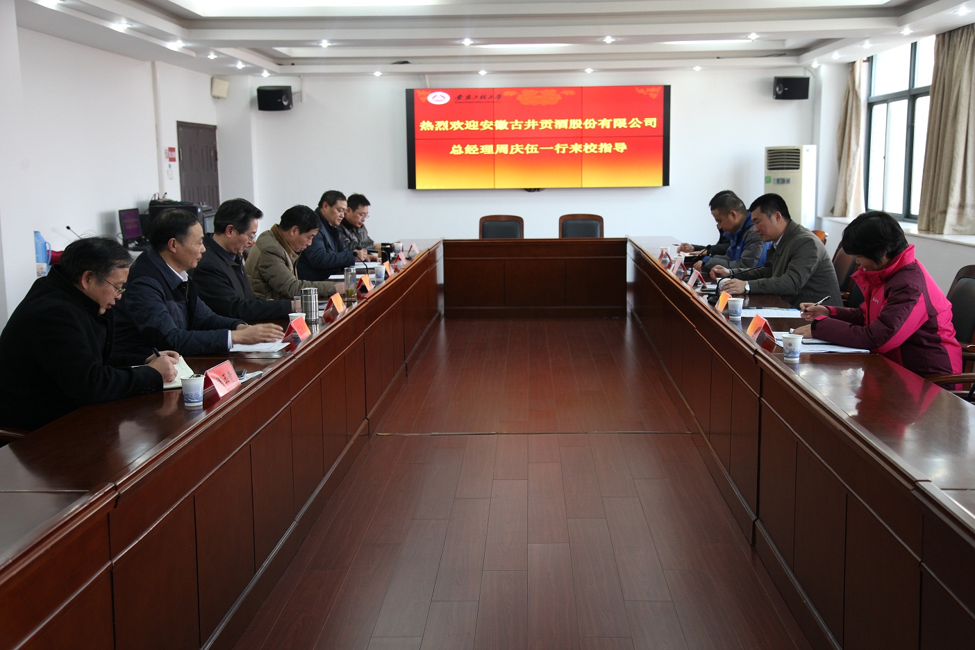 12月15日下午,安徽古井集团党委副书记、安徽古井贡酒股份有限公司总经理周庆伍率公司高管王素彬、高家坤、万春环及芜湖区域总经理张金扣来校洽谈校企合作事宜,并为大学生作就业创业辅导报告。校党委书记陈其工会见了周庆伍一行并出席报告会。校长刘宁、副校长郭兴众,办公室、学生处、科技处、研究生部、生物与化学工程学院负责同志出席校企合作洽谈会。