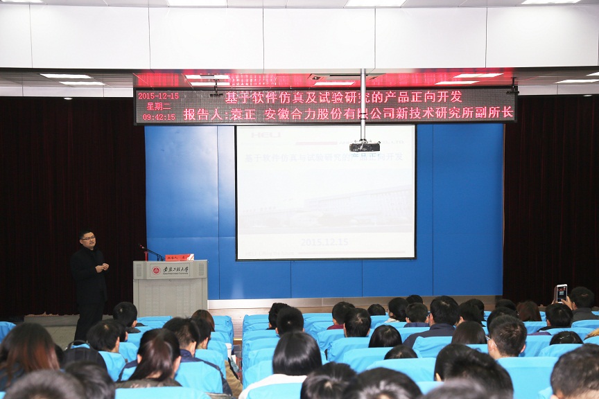 期间,安徽合力股份有限公司新技术研究所副所长袁正在5教116为我校师生做了题为《基于软件仿真及试验研究的产品正向开发》的学术报告。我校机械、电气、计算机等相关专业教师、研究生和高年级本科生聆听了报告会。