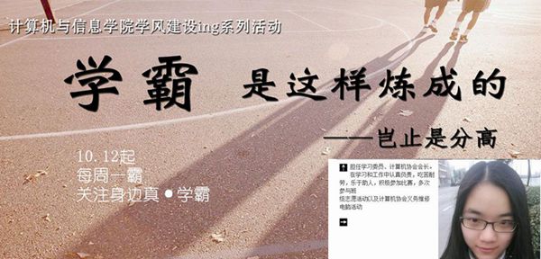 作为“学风建设ing”系列活动,学院紧密贴合时代特色和当代大学生的心理需求,借助现代网络平台(以新浪微博,腾讯微博和微信公众号为平台),推出“每周一霸”,以优秀学生代表的典型事迹为主题,通过线上互动,展示他们的风采,发挥榜样示范引领作用。同学们可以通过三大平台提出自己关心的问题,每周学霸嘉宾会在平台予以解答。从目前微博、微信平台上的互动来看,同学们通过与学霸的交流懂得了正确的学习态度和科学的生涯规划的重要性,在敬佩优秀学生取得的成绩的同时,内心里迸发了赶超的愿望和决心。学院以后将把每周学霸的寄语和交流汇编成《学霸修炼手册》进行推广。