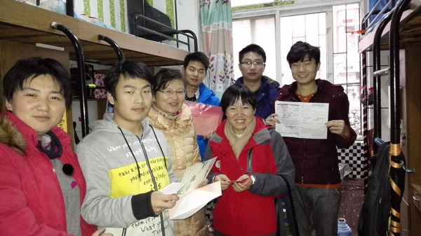 12月24日中午、25日上午,人文学院党委副书记金艾裙、教师蒋艳、辅导员李婕和谢红翠一行带着全院所有老师的祝福,来到学生寝室,亲切慰问了2016年考研学子。金艾裙一行在询问了同学们临考前的生活和学习情况后,为每位考研学生送上学院精心准备的贺卡、签字笔等考试用具,并鼓励同学们做好应试准备。