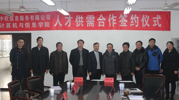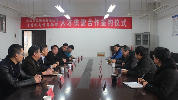 中软信息服务有限公司总经理杨卫红一行与计算机与信息学院院长周鸣争进行了亲切交流,双方在各自介绍情况的基础上对全面合作提出了初步设想,经充分沟通协商,签订人才供需合作协议。