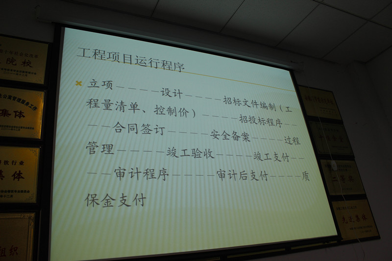 培训会上,后勤集团工程办负责人文学飞以PPT方式从项目立项、招投标、合同签订、过程管理、工程验收到财务支付、项目审计、质保金支付、台账式档案管理等全过程进行了详细讲解,并分享了平时工作中的经验和作法。部门专家结合我校实际分别从各自部门相关工作给予了精心指导,提出了建议以及注意事项。最后大家各抒己见,充分发表意见,相互沟通交流,会场气氛热烈融洽。