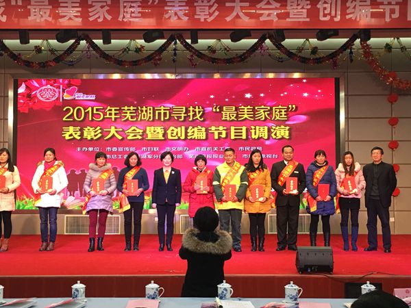春节前夕,由市委宣传部、市文明办、市妇联等九家单位联合举办的2015年芜湖市寻找“最美家庭”表彰大会暨创编节目调演在市中医院小礼堂举行,我校教师虞满华家庭荣获芜湖市十大“最美家庭”荣誉称号,并参加了颁奖仪式。