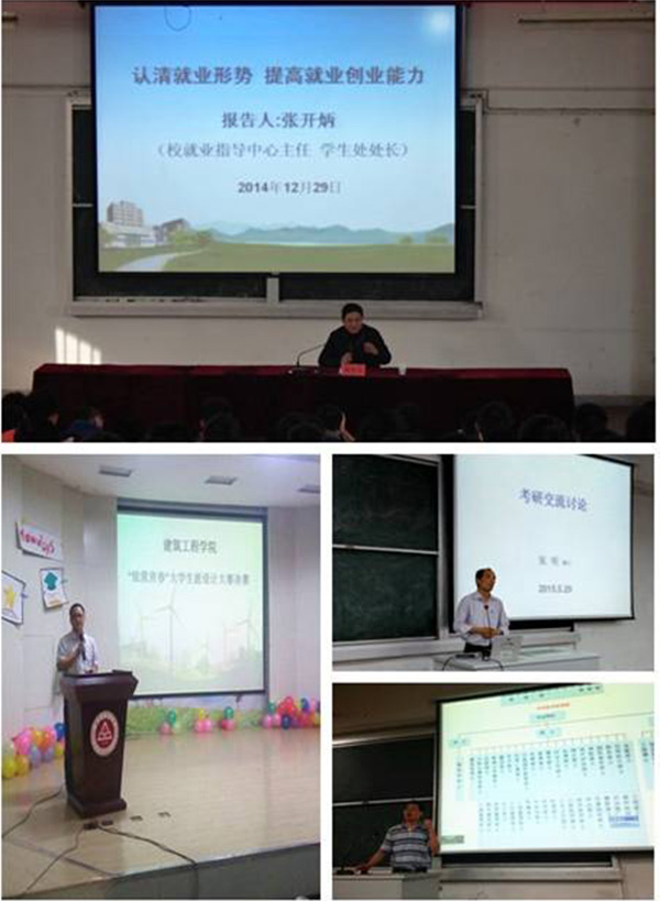 “大学生涯设计”活动中穿插着“学长伴我行”、“博士面对面”、“本科生导师谈学习方法”、“专业负责人谈专业发展”、“辅导员谈心谈话”等活动。“职业生涯规划”活动中举办了“优秀毕业生报告会”、“考研报告会”、“就业创业形势报告会”、“求职简历制作辅导”、“职业模拟大赛”、“职场成功人士访谈”等活动。