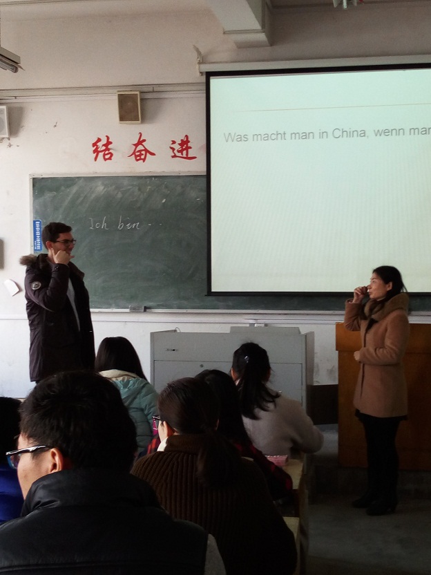 2月26日上午,Matthias Gilchlai在芜湖德绍工作人员陪同下,走进2号教学楼304教室,观摩我校德语课堂教学,并与外国语学院选修第二外语(德语)学生进行了现场互动交流,了解学生进一步学习德语、去德国深造的意愿,并与我校德语教师合作,为学生奉献了一堂精彩纷呈的课堂教学。