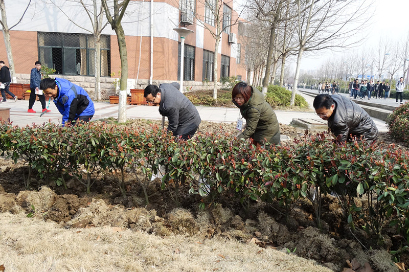 为呼吁同学们一起努力创造美好校园环境,促进学校绿化,3月12日植树节当天,后勤集团总经理助理杨国太、校管中心主任黄培庆、副主任沈晨月及校园物业外包单位负责人一起携手,在师生活动中心校庆纪念树周边,种下了一片高杆红叶石楠,用他们辛勤的双手把校园装点得春意盎然。
