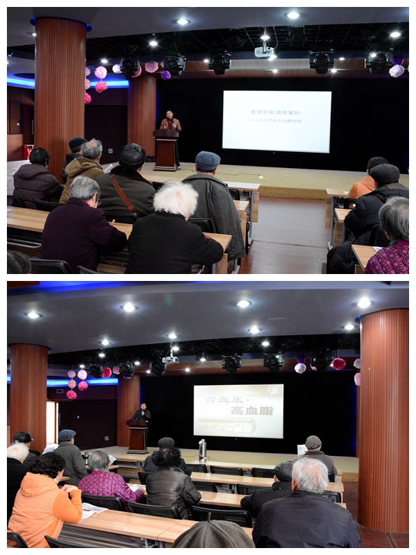陆宁介绍了高血压、高血脂的病理以及两者的关系,并为教师们讲解了许多平时用药过程中可能存在的认识误区。潘庆丰为大家普及了糖尿病的控制机理等相关知识,并一再提醒:只关注糖尿病空腹血糖的调控其实是远远不够的,餐后血糖控制对整个病情控制贡献率更大。在场的教师们认真听讲,仔细记录,十分专注!
