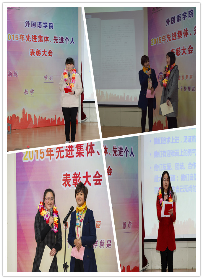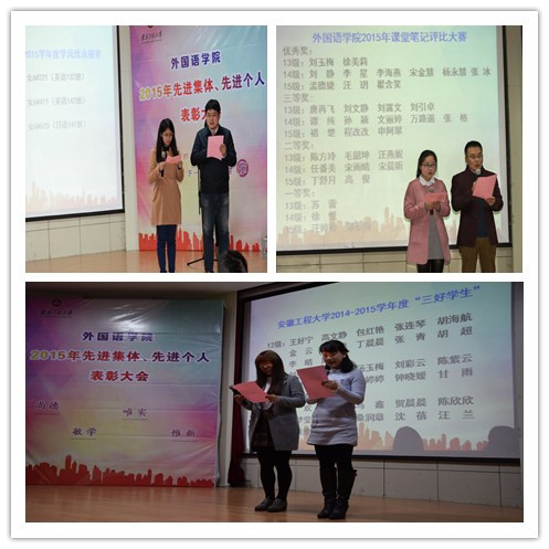 英语系主任李新国、日语系副主任童富智和全国高校外语教学大赛三等奖获得者汪景峰与国家奖学金获得者赵静、省品学兼优毕业生费雁鸿、校十佳志愿者王楠楠一起宣读了各奖项的获奖名单。