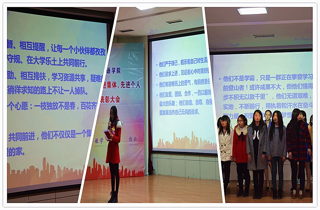 三月的校园,垂柳依依、鸟语花香。外国语学院2015年先进集体、先进个人表彰大会3月23日下午在学术报告厅隆重举行。校学生处、团委、教务处和学院党政领导、专业教师、辅导员及全体学生参加了表彰大会。表彰大会由辅导员王钰主持。