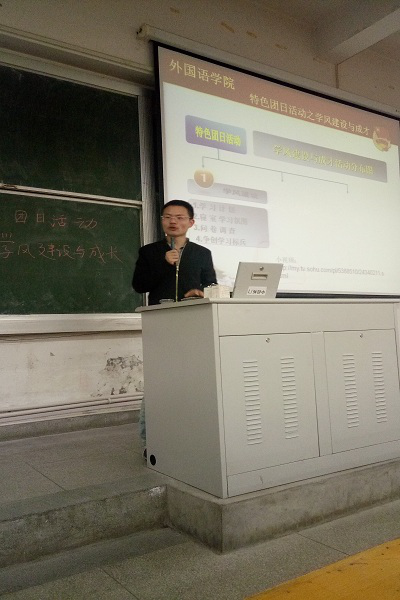 活动开始,主持人就前期的学风问卷调查反映出的学风情况做了一个分析和总结,指出普遍存在的问题,如:学业难度加大、学习热情不高、学习目标不明确等。接着,班长、学习委员、优秀学生代表分别从各自的角度发言,谈谈解决问题的方法。根据活动安排,各寝室长轮流介绍总结了本寝室的学风状况,并就树立良好室风分享了自己的计划和安排。此次活动还邀请了考取南京师范大学研究生的大四学长王好宁与同学们分享了自己的考研心路历程,他就“坚定信念、找准定位、持之以恒”三个方面为同学们讲解了如何考研的问题;他勉励大家要树立和发扬不怕困难、自强不息的精神,在考研中淬炼自己的意志,丰富自己在校学习和生活。