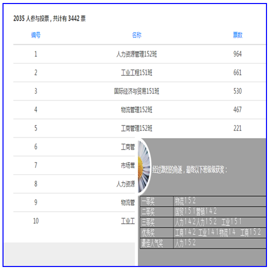 经过评委打分和微信投票,最终物流152团支部获得一等奖,国贸151、营销142团支部获得二等奖,人力142、人力152、工业151团支部获得三等奖。人力152团支部获得最佳人气奖。