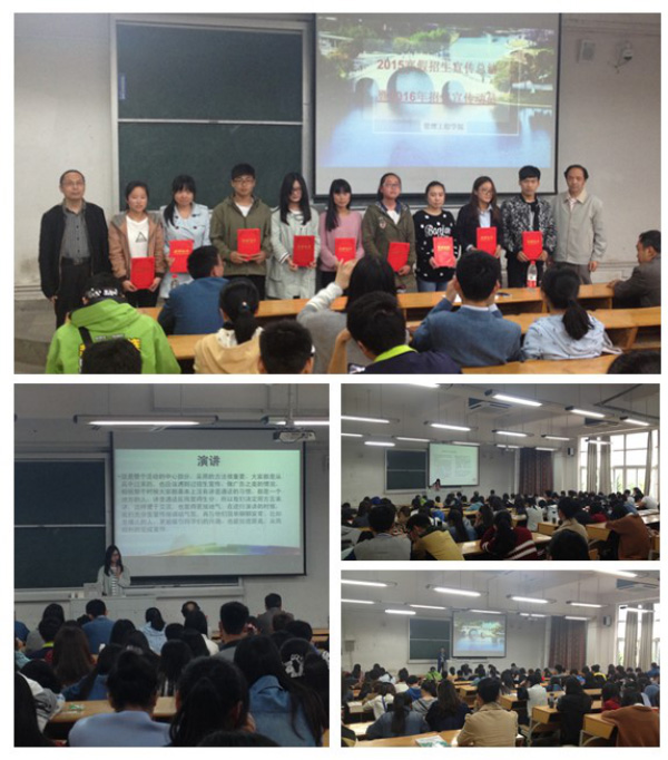 招生宣传工作是提高学校生源质量的重要手段和基本保证。大学生回母校招生宣传,是增强与母校联系,提高社会实践能力的重要渠道,也是爱校荣校使命感与责任感的重要体现。近日,管理工程学院在二教206召开了2015年寒假招生宣传总结暨2016年招生宣传动员会,学院党政领导、全体辅导员以及参加2015年寒假招生宣传的100多名同学参加了会议,会议由学院团委副书记朱文明主持。