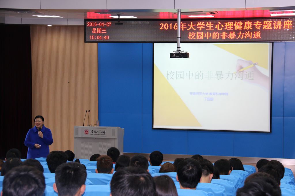 4月27日,学校在五教录播教室举办了一场题为《校园中的非暴力沟通》的心理健康讲座,主讲人丁园园系安徽师范大学教育科学科院心理学系副教授、硕士生导师。参加本次讲座包括全校心理委员、学院心理健康学生组织和学生干部的代表,以及担任各学院心理健康工作联络员的辅导员。