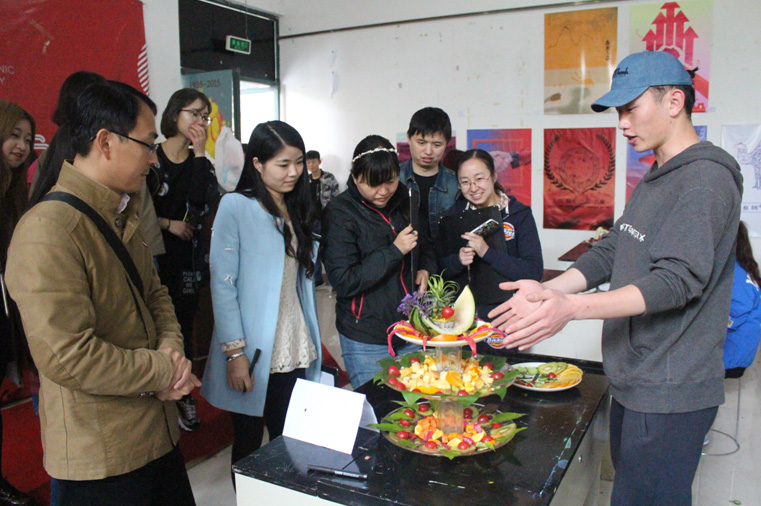 在30分钟的比赛时间内,各参赛选手以自己准备的各种瓜果蔬菜为材料,在保持瓜果蔬菜原味的基础上,进行合理的雕刻、搭配以及拼凑,使之成为一道味觉与视觉均佳的艺术品。各组完成作品后向公众展示,供广大师生及评委欣赏品味并评选。选手在有限时间内完成作品创作,充分展示了参赛者对主题的理解能力、动手能力、创新思维和团队协作精神。