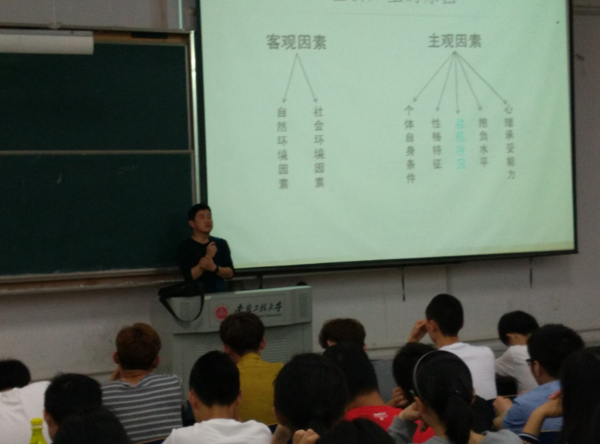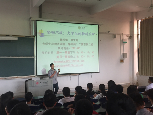 5月4日下午,在给土木工程和建筑学专业专题讲座中,杜松涛从认识挫折、引发挫折的主要因素、挫折的分类、大学生挫折的特点挫折的应对、以及辩证看待挫折几方面向大家做了详细的介绍,期间通过现场测试让同学们认识到了自身挫折的承受能力。最后他鼓励同学们要发现自己的优点,找出榜样人物,肯定自己的能力。